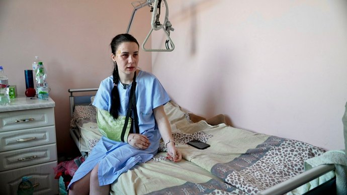 "Мені повитягували дуже багато осколків зі спини. Були глибокі рани на спині біля нирки. В мене струс мозку, контузія, на одне вухо зовсім не чую. Позашивали мені руку, дуже багато швів. Також у руці ще залишився осколок, його не дістали. Якщо не буде гнити, то й не будуть, бо він дуже глибоко і треба буде розрізати", — жінка показує травмовану руку.