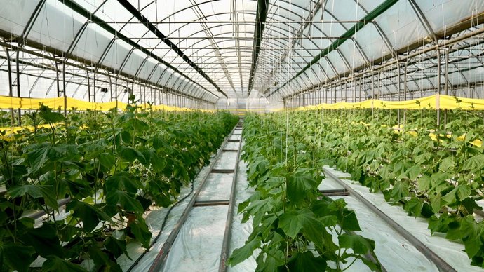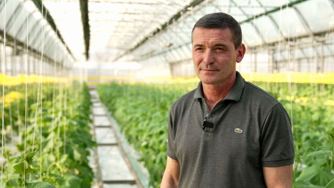 Один момент, який ми не можемо врегулювати в теплиці, — це сонце. Якщо є сонце — у нас тоді щедрий, гарний урожай. Нічна температура повинна бути 18-19 градусів тепла, денна при сонячному дні +25, при похмурому — 21-22 градуси. Це все регулюється вентиляцією, опаленням, яке йде по теплиці. Огірок, як ми всі знаємо, на 90% складається з води, і поливи — це дуже важливо. Якість води і контроль за цим".