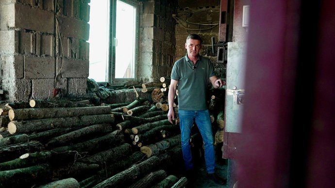 "Котлом ми опалюємо 44 сотих. Котел твердопаливний, він може працювати і на дровах, ось через цю топку, або через бункер на будь-чому сипучому. Виручив він нас дуже в цю зиму, хоча нам насправді потрібно приблизно 1,2 мегавата, він має 0,7 мегавата. Дуже важка зима була через ці морози, дуже велика інтенсивність закидання дров у цю топку, щоб ви могли уявити, це що 20 хвилин треба було закидати дрова, коли надворі було мінус 25. Цілу ніч. Спалювали приблизно 15-18 складометрівЦе одиниця вимірювання об'єму дров, складених у штабель, що займають простір метр на метр. тільки за ніч, не рахуючи дня".