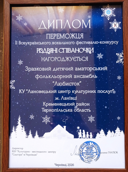 Зразковий дитячий аматорський фольклорний ансамбль «Любисток» став переможцем І туру Всеукраїнського вокального фестивалю-конкурсу «Різдвяні співаночки».