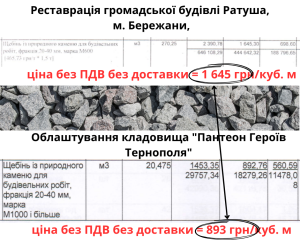Щебінь фракції 20-40 мм врахували по 1 645 грн/куб. м, доставка врахована окремо та складає 699 грн/куб. м. У листопаді моніторинг ДП «НІРІ» Держвідновлення фіксував ціну щебеню 20-40 мм на Тернопільщині на рівні 755 грн/куб. м (629 грн/куб. м без ПДВ), що в 2,5 раза дешевше.