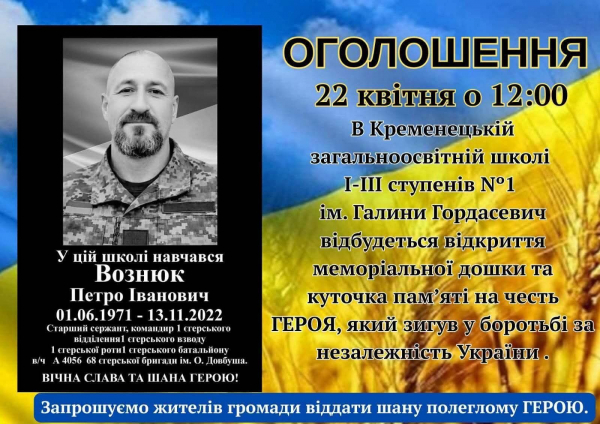 Місцевих жителів запрошують вшанувати пам’ять воїна Вознюка Петра Івановича (01.06.1971 – 13.11.2022) та віддати шану полеглому Герою.