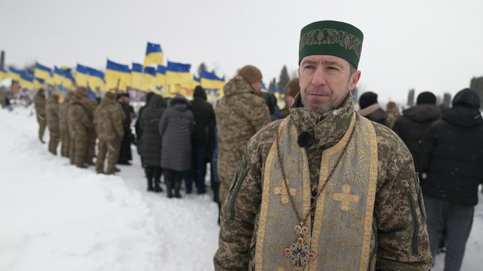 Попрощатися із загиблим бійцем прийшов військовий капелан Володимир Синьковський.
