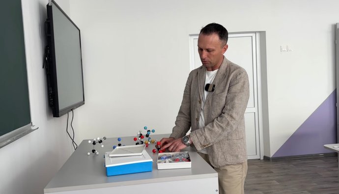"Приміром, будуємо кулестрижневу молекулу речовини метан. Потім учні несуть мені її на демонстраційний стіл і доводять, що ця речовина є саме метаном. Тобто, розказують, що це є атом карбону, червоним кольором — 4 атоми гідрогену, їх зʼєднують хімічні звʼязки.