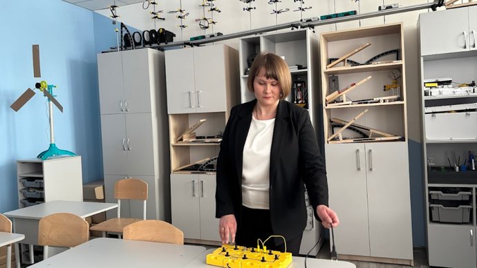 Тепер у нас є набір з оптики. Є розсіювальна лінза, бачимо фокус на відстань мінус 100 діоптрій, збірна лінза — плюс 50 діоптрій. Також у нас є такі машинки, які можемо використати для дослідження маси й інерції тіла", — сказала вчителька фізики Оксана Юник.