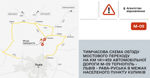 “З 10:00 27 квітня 2026 року буде перекрито рух мостом на дорозі M-09 на Львівщині. Це пов’язано з початком ремонтних робіт на мостовому переході, що розташований на автомобільній дорозі державного значення М-09 Тернопіль – Львів – Рава-Руська (на м. Люблін) км 141+459, у межах селища Куликів. Орієнтовний термін проведення робіт — 3 місяці (попередньо до 27 липня 2026 року)”, – йдеться у дописі служби відновлення Львівської області.