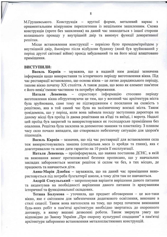 "До нас громадська організація "Брами Тернополя" не приходила, не повідомила, не представила жодного документу, ні експертизи незалежної про те, що ця решітка безпечна для життя і здоров'я, як перехожих, так і для учасників нашого освітнього процесу. І кошторису так само ми не бачили. Спочатку вони казали, що це вітражне вікно, потім вони кажуть, що це світлячок. Ми такого в жодному архіві не знайшли. Облрада була тут, а значить, це був неокласицизм радянських часів. Так у нас написано в паспорті", — сказала Наталія Левенець.