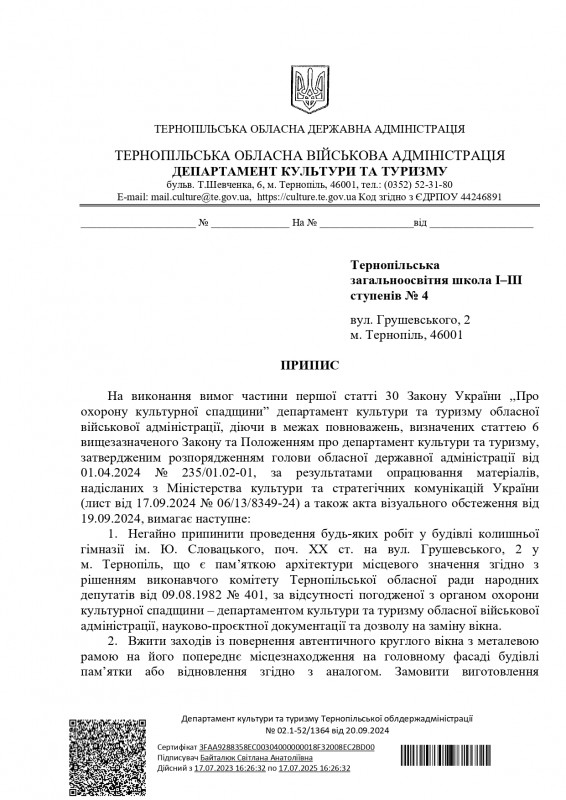У вересні минулого року кореспонденти Суспільного надсилали інформаційний запит до департаменту культури і туризму Тернопільської ОВА. Нам відповіли, що школа не повідомляла і не зверталася до департаменту щодо заміни вікна на пластикове. Оскільки будівля колишньої гімназії імені Юліуша Словацького початку XX століття і є пам’яткою архітектури місцевого значення, то власник чи користувач зобов’язаний утримувати пам’ятку в належному стані. Заборонено змінювати призначення пам’ятки, її частин та елементів без дозволу відповідного органу охорони культурної спадщини. Тому згідно з пунктом 6 та 14 частини першої статті 6 Закону України "Про охорону культурної спадщини" адміністрація четвертої школи повинна забезпечити повернення автентичного круглого вікна з металевою рамою на його попереднє місце на головному фасаді будівлі пам’ятки або відновити вікно згідно з автентичним.