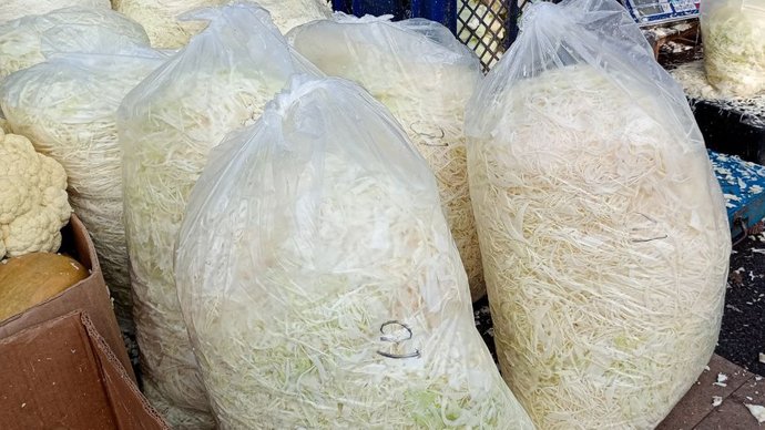 На Тернопільському ринку — сезон продажу січеної капусти. Підприємці купують овочі у фермерів і шаткують її просто на базарі. Цьогоріч шаткована капуста вдвічі дешевша, ніж торік.