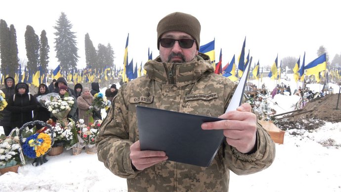 "Ми зібрались тут, щоб віддати шану справжньому патріоту України, мужньому і рішучому воїну. Номеру обслуги механізованого відділення, механізованого взводу, механізованого батальйону військової частини А4712 солдату Скороплясу Андрію Андрійовичу", — говорить офіцер обласного територіального центру комплектування Федір Приступа.