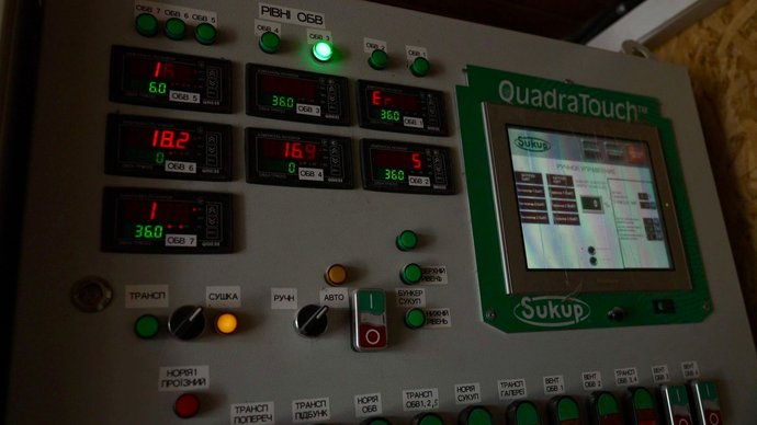 "За допомогою зворотних зав’язків, ця друга сушарка автоматизована від кінцевого — від температури сушіння зерна. Сушіння зерна відбувається максимально при температурі 90 градусів. Залежно від потреби і якості біопалива, комп’ютер управляє процесом дозування або повітря, або палива. Паливо — це суміш різних видів полови. Це те, що колись викидалося в яри, ставки, яке нікому не було потрібне. Ми використовуємо це все для спалювання і вироблення електроенергії. У нас є бункер добової необхідності для сушки. Засипаємо і в автоматичному режимі сушка працює добу. Завдання оператора тільки по приладах відслідковувати правильність роботи і реагувати в критичні або нетипові режими".