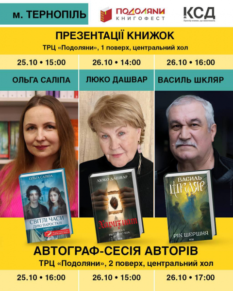 Видавництво «Клуб Сімейного Дозвілля» представить своїх авторів – Ольгу Саліпу, Люко Дашвар та Василя Шкляра, які проведуть презентації книжок і автограф-сесії. Зустрічі відбудуться 25–26 жовтня у центральному холі ТРЦ «Подоляни».