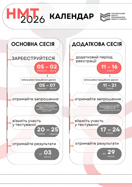 «Радимо потенційним учасникам та учасницям заздалегідь зафіксувати важливі етапи проведення НМТ в особистому календарі», – зазначили в Українському центрі оцінювання якості освіти.