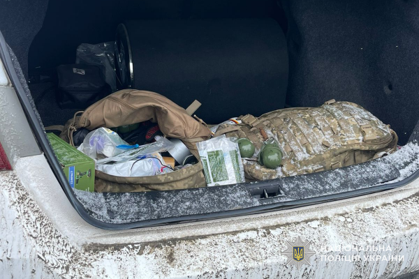 Під час поверхневого огляду автомобіля правоохоронці виявили у багажному відділенні камуфльований рюкзак одного з пасажирів. У ньому знаходилися три гранати РГД-5 із запалами, 89 патронів калібру 5,45 мм та димова граната.