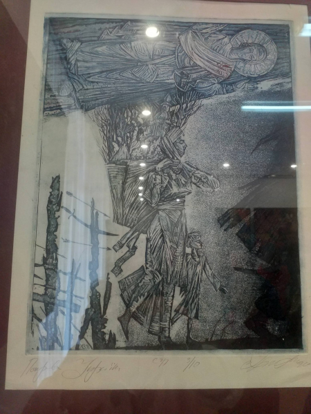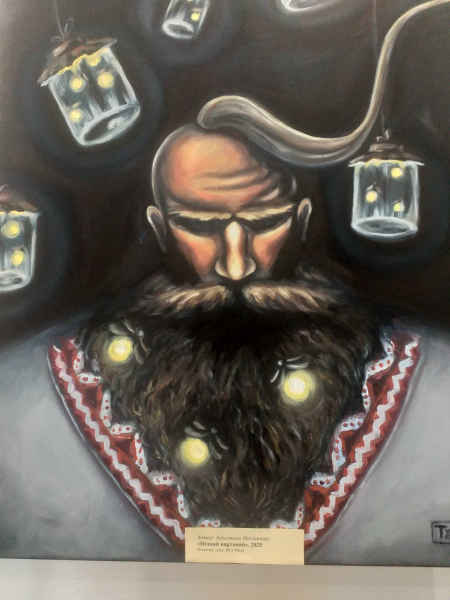 В картинах багато болю, але надію вселяє “Сучасний Мамай”, де козак у військовій формі з протезованою ногою, тримає в руках ядро чи то гранату. Зверху летить дрон, а він, знай, говорить із невидимими силами і посміхається. Це символ нашого Харкова і інших міст України», – йдеться у повідомленні.