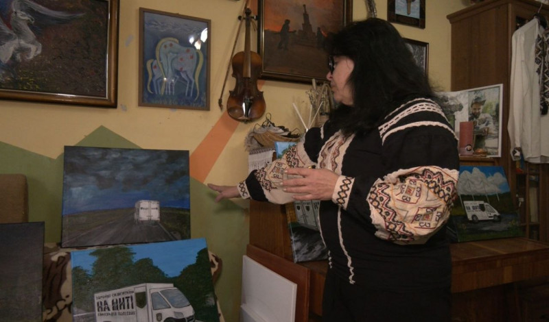 На полотнах жінка зображує сюжети, пов'язані із роботою місії "На щиті" — авто, що евакуює тіла полеглих. Як розповіла Христина Довгалюк, картини планує продати, а гроші задонатити на евакуацію полеглих.