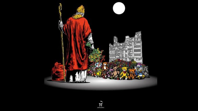 На чорному фоні — зруйнований будинок. Під ним — гора іграшок та квітів. Святий Миколай поклав торбину з подарунками поруч себе і стоїть, схиливши голову у скорботі.
