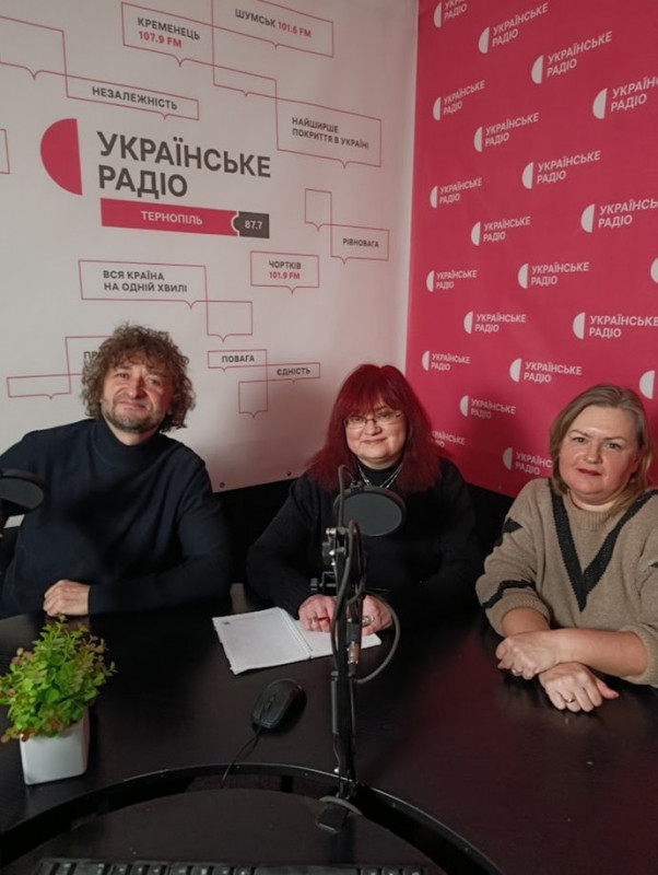 Володимир Трач, Олена Лайко та Наталка Андрушко-Колтун в радіостудії. Суспільне Тернопіль
