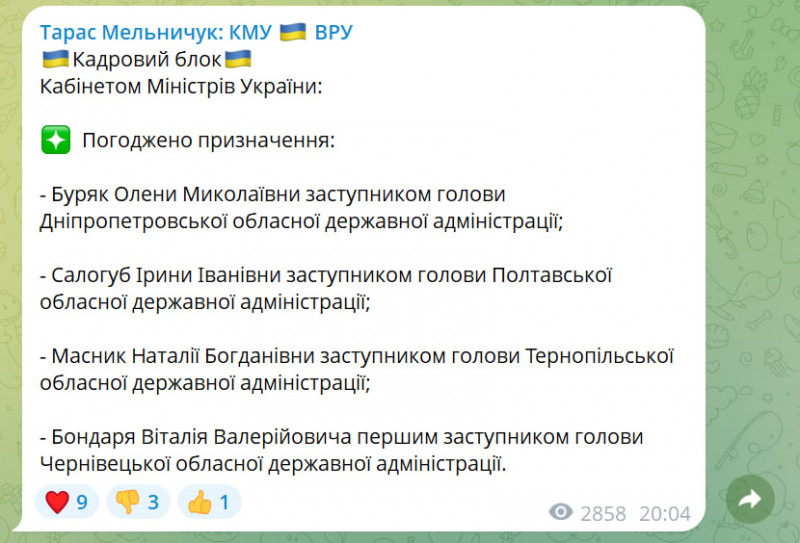У середу, 1 квітня, Кабінет Міністрів погодив призначення Наталії Масник заступницею голови Тернопільської обласної державної адміністрації.