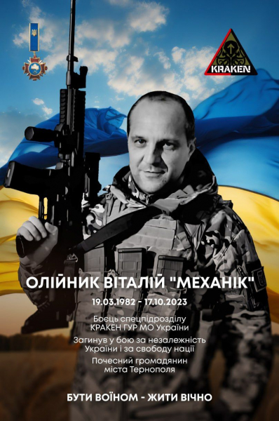 Віталій Олійник з позивним «Механік» був воїном-добровольцем спецпідрозділу «Кракен» Головного управління розвідки міністерства оборони України. Загинув у бою 17 жовтня 2023 року на Слобожанщині.