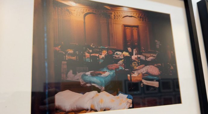 "Тут маємо на стіні світлини з перших днів повномасштабного вторгнення з вокзалу тут в Перемишлі. Це світлини, зроблені нашим другом Адамом Яремою, він з Перемишля також".