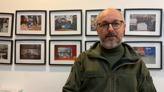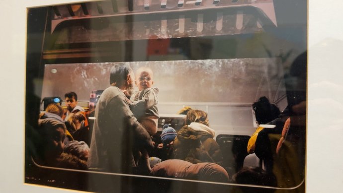 На стінах цього кабінету фотографії українських біженців: люди в потязі, на пероні, біля волонтерських наметів.