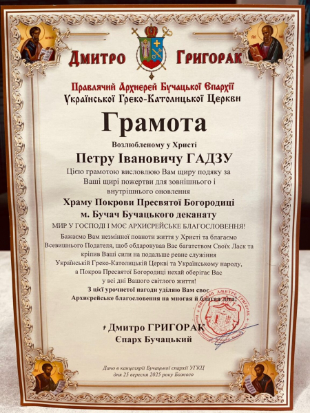 «Грамота Возлюбленому у Христі Гадзу Петру Івановичу. Цією грамотою висловлюю Вам щиру подяку за Ваші щирі пожертви для зовнішнього і внутрішнього оновлення Храму Покрови Пресвятої Богородиці м. Бучач Бучацького деканату», — йшлося у зверненні.