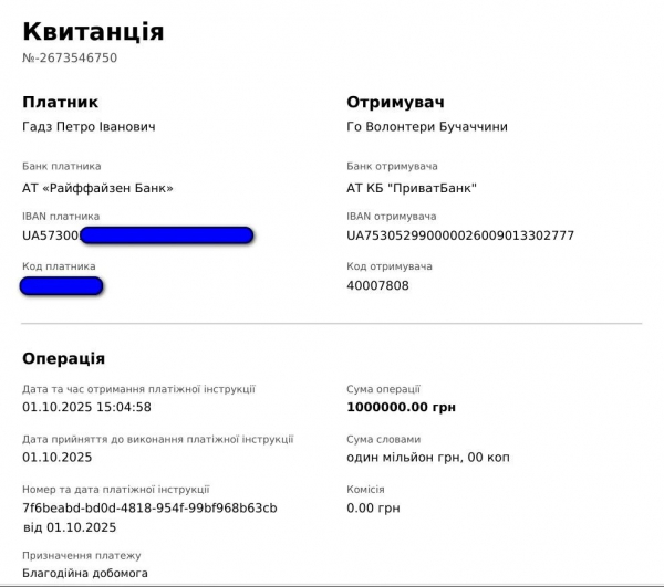 Саме тому благодійник оголосив про значну пожертву: один мільйон гривень він скерував на допомогу Збройним силам України, перерахувавши кошти на рахунок волонтерської організації ГО «Волонтери Бучаччини».
