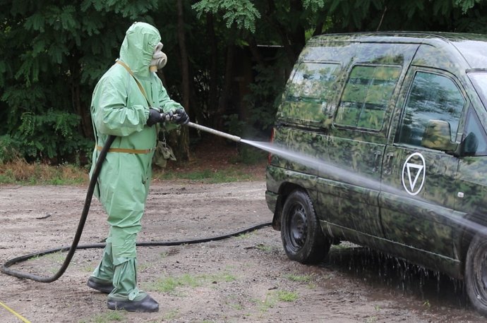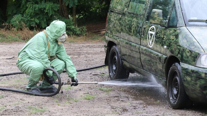 Спочатку працює РХБ розвідка, заміряє фон, чи є допустима норма, чи перебиває (завищена). Якщо перебиває, то є потреба в деконтамінації. Тоді наш особовий склад заводить техніку у відведене місце, машина глушиться, люди в машині можуть залишатися, але їх також перевіряють. Бували випадки, коли машина контактувала з зараженою ділянкою просто одним колесом. І коли авто їде, з колеса бризкає піском чи брудом на кузов або дно автівки. І машина буде "фонити". Але в таких випадках вистачить збити водою таке забруднення. Для сильнішого забруднення можна використати СФ-2У – спеціальний порошок, який розводиться водою. Після деконтамінації ще раз проводяться заміри: якщо допустима норма є, то все ок. Переважна більшість випадків — у межах норми.