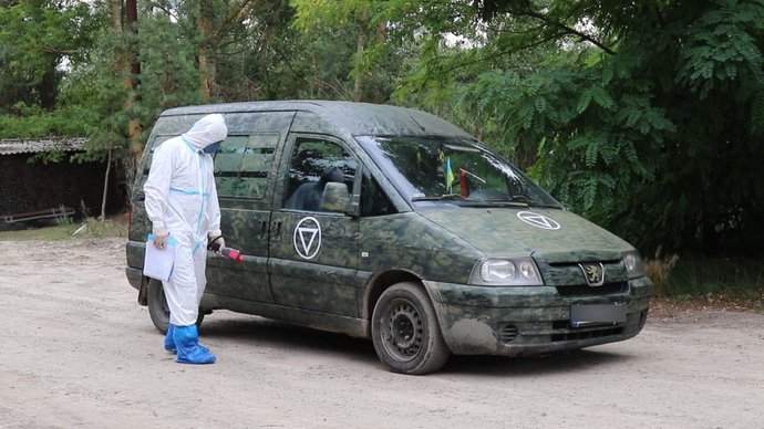 Військовослужбовець підрозділу РХБ захисту 704 обр РХБ захисту проводить деконтамінацію авто в Чорнобильській зоні. 704 окрема бригада РХБ захисту Сил підтримки ЗСУ