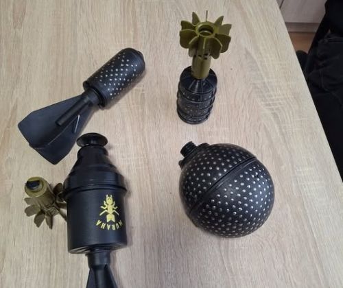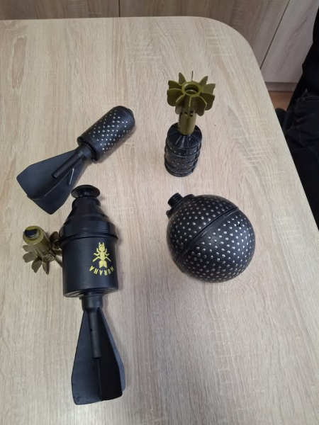 На оприлюдненому фото видно кілька макетів боєприпасів різної форми: подовжені та округлі елементи чорного кольору з хвостовими стабілізаторами, а також деталі з металевими ребрами та різьбленням. Частина з них має характерну форму сферичних корпусів із текстурованою поверхнею.