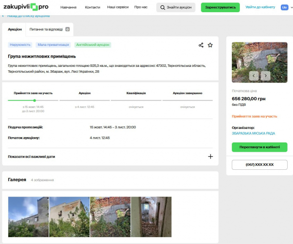 Стартова ціна будівлі – 656 280 гривень.