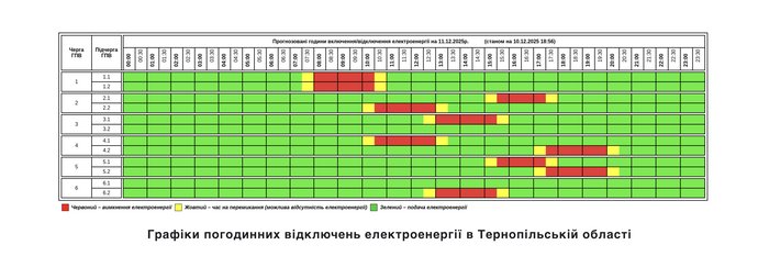 Графік погодинних відключень електроенергії в Тернопільській області на 11 грудня 2025 року. Скрин з сайту “Тернопільобленерго”