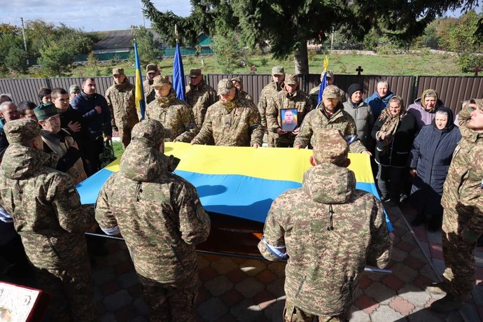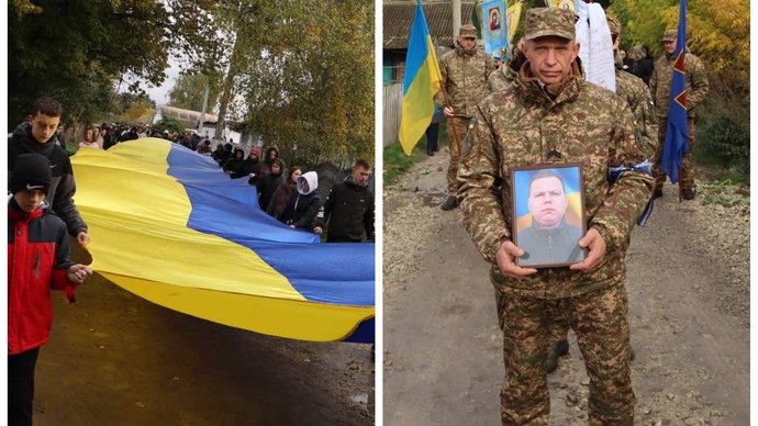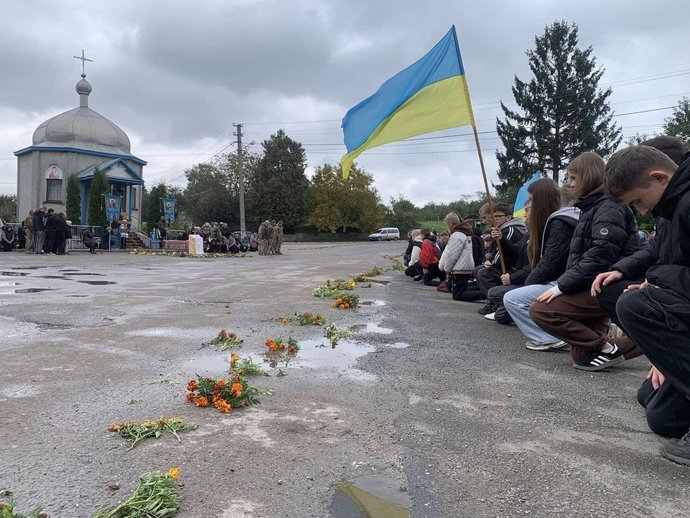 Труну з тілом Ігоря Кривогубця накрили жовто-блакитним прапором. Борсуківська громада