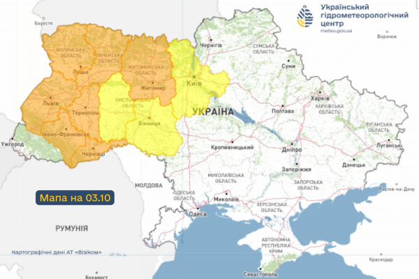 У ніч на 3 жовтня заморозки прогнозують вже у повітрі – 0–3°. Тернопільщина потрапляє до ІІ рівня небезпечності (помаранчевий).