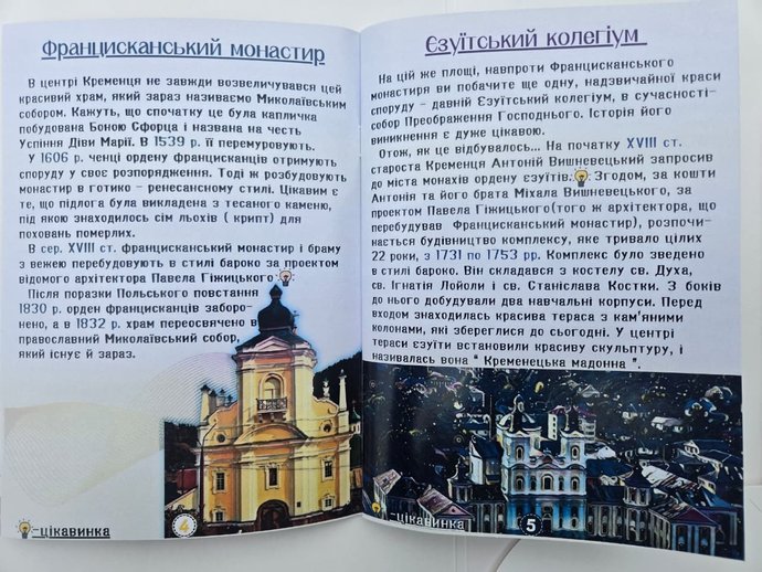 "Діти — це категорія відвідувачів, яких важко зацікавити. Вони не люблять слухати довгі нудні екскурсії, сухі цифри, історичні факти. Тож передавати їм інформацію потрібно по-іншому. У нас є спеціальні екскурсії для дітей, квести, і тепер з’явився цей путівничок із пам’ятками Кременця, який покликаний пробудити цікавість до історії краю", — говорить Василь Ільчишин.