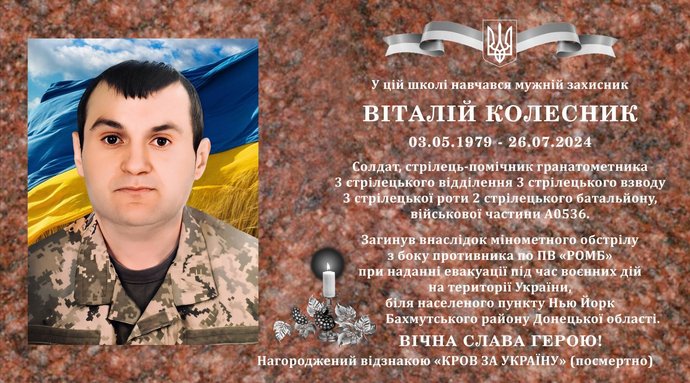 На Тернопільщині відкрили меморіальну дошку військовослужбовцю Збройних сил України Віталію Колеснику. Її встановили у Жизномирі на фасаді школи.
