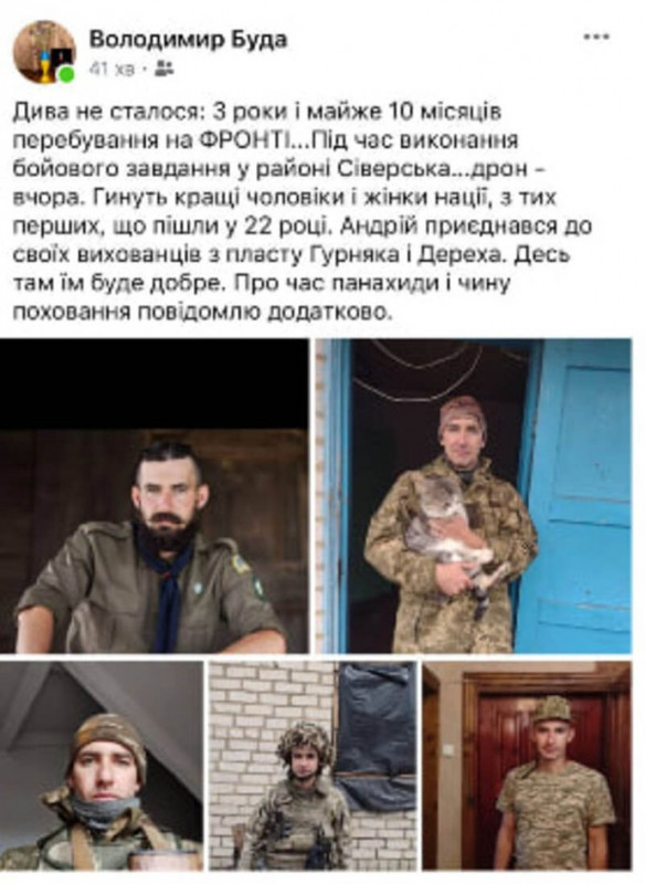 "Дива не сталося… Під час виконання бойового завдання у районі Сіверська…дрон — вчора. Гинуть кращі чоловіки і жінки нації, з тих перших, що пішли у 22 році. Андрій приєднався до своїх вихованців з пласту Гурняка і Дереха. Десь там їм буде добре".