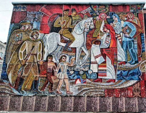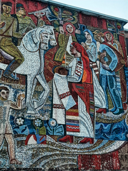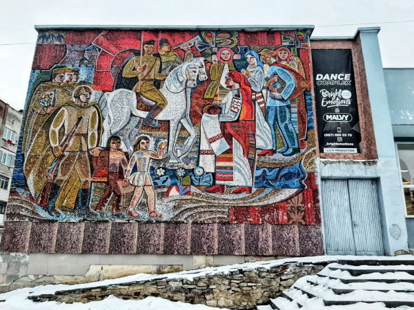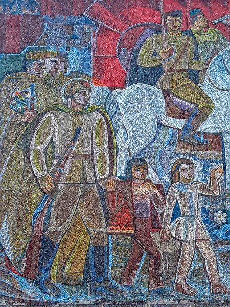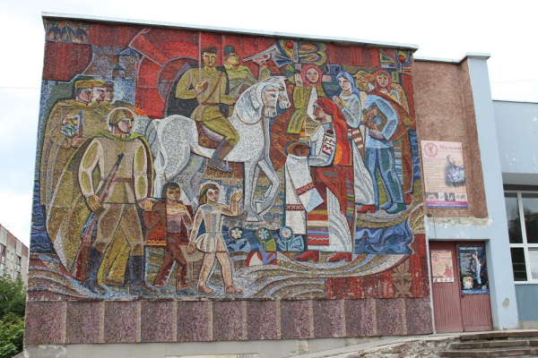 “Тернополяни” з’ясували, що дана мозаїка є найбільшою у Тернополі – виготовлена місцевим майстром, та на жаль присвячена солдатам Червоної армії, які повернулися після перемоги у Другій світовій війні (якщо коротко, панно “асвабадітєлі”).