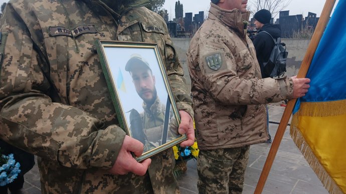 Бійці тримають портрет бійця Назара Ковальчука. Суспільне Тернопіль