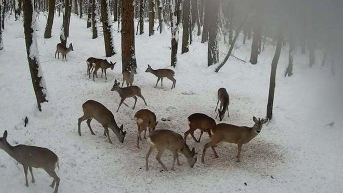У Бережанському надлісництві на Тернопільщині фотопастка зафіксувала гурт козуль, який прийшов на підгодівельний майданчик. Вони кілька разів приходили їсти корм.