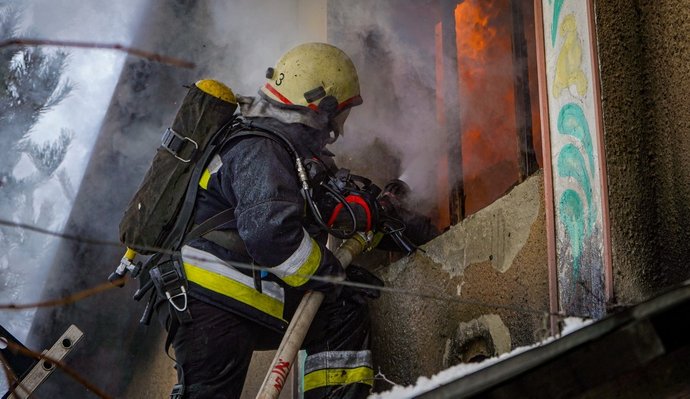 Рятувальник гасить пожежу в будинку. Головне управління ДСНС у Тернопільській області