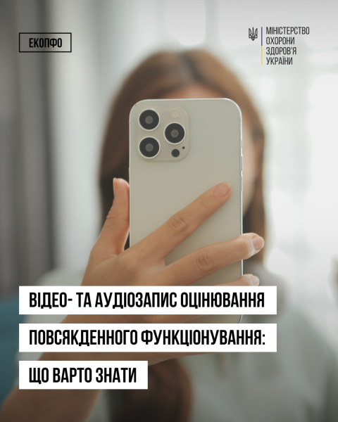Під час оцінювання повсякденного функціонування може здійснюватися відео- та/або аудіофіксація розгляду справи експертною командою, а також фотофіксація документів, що формуються під час оцінювання. Це передбачено Порядком проведення оцінювання повсякденного функціонування особи, затвердженим постановою Кабінету Міністрів України від 15 листопада 2024 р. № 1338. Про це зазначили у МОЗ та детальннішее розповіли про особливості зазначених процедур.