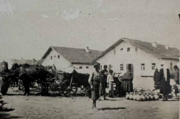 На передньому плані видно гончарські вироби, а на задньому фоні — 35 єврейських крамниць, що свідчить про активне торгове життя містечка.