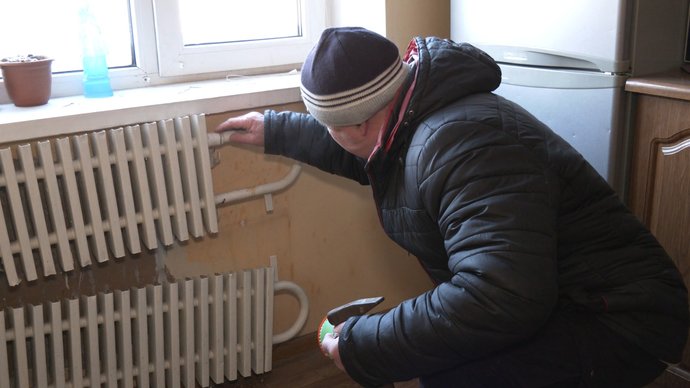 "Батарея є, вона потекла тут. Під заміну батарея, сказали, що будуть міняти. Таке саме стояк гарячої води. Кран замерз — треба міняти. В спальні теж батарею розірвало, в одному місці потік, тут розірвало, то також мають поміняти", — говорить Василь Шкаб.