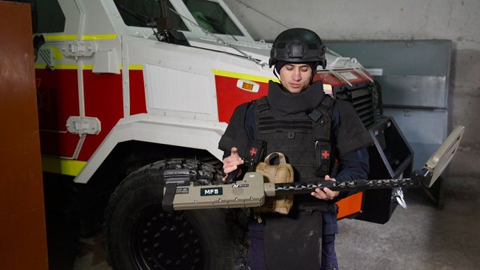 Піротехнік Олександр Осадчий показав прилад, за допомогою якого шукає вибухівки. Пожежно-рятувальна служба Тернопільщини