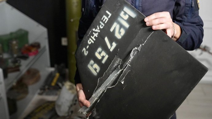 "Це залишок російського БПЛА "Герань-2". Шахед, який кожного дня атакує Україну. Дуже багато залітає на нашу територію. Це на базі іранського 166 шахеда. Він прилітає в інфраструктуру, вибухає, і пошкоджує його. Це велика проблема, бо їх є дуже багато. Безпілотник несе в собі бойову частину — від 45-50 кілограмів до 90 кілограмів вибухівки. Це велика кількість вибухівки, особливо якщо летить рій — 5-6 дронів. Це може завдати великої шкоди, наприклад, електропідстанції. Буває таке, що він прилетів, впав і не вибухнув, тоді викликають нас, ми його знищуємо. Є ось така його частина і така. Це все з одного шахеда. Такий вигляд він має, коли спрацював".