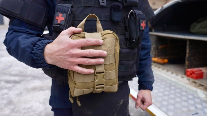 "Каска і бронежилет разом важать 16 кілограмів. Бронежилет має бути шостого класу захисту. Ще додаткове обладнання і буде до 18 кілограмів. Є аптечка для надання першої домедичної допомоги — припинення критичної кровотечі. Є турнікет, що кріпиться на бронежилет, під рукою, щоб швидко дістати, і є запасні в аптечці. Загалом маємо по чотири турнікети".