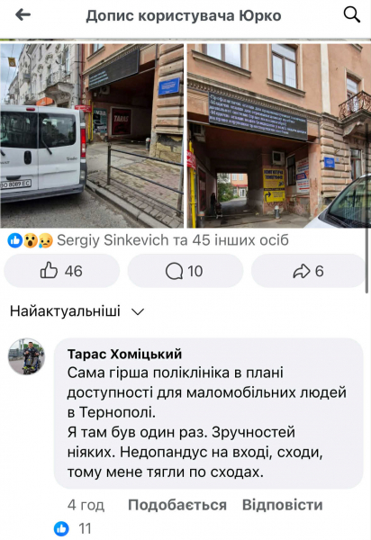 «Сама гірша поліклініка в плані доступності для маломобільних людей у Тернополі. Я там був один раз. Зручностей ніяких. Недопандус на вході, сходи, тому мене тягли по сходах».