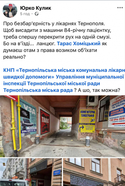 Громадський активіст Юрко Кулик на своїй сторінці у Facebook розповів про труднощі, з якими стикаються маломобільні люди біля Тернопільської міської лікарні швидкої допомоги.